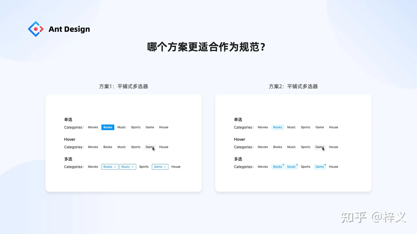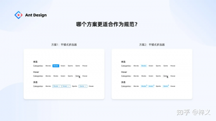 以我們開(kāi)篇第四個(gè)問(wèn)題提到的組件「平鋪式多選器」為例,我們到底該選哪個(gè)方案作為規(guī)范納入設(shè)計(jì)系統(tǒng)當(dāng)中呢?