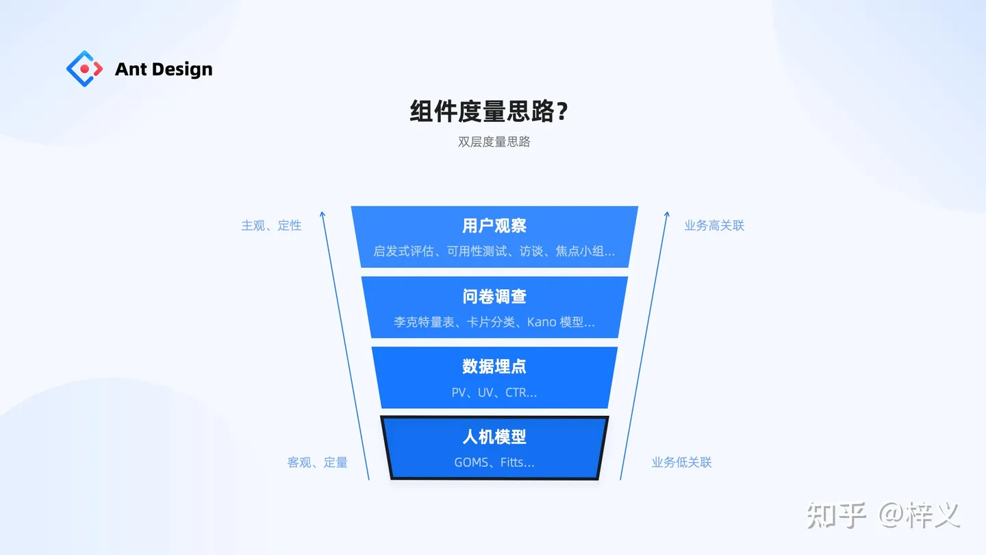 在設(shè)計(jì)研究領(lǐng)域,調(diào)研思路可抽象為以下幾類(lèi)。第一 part 提到組件的本質(zhì)是「行為的規(guī)范」,因此對(duì)組件的評(píng)估,我們同樣聚焦到如何評(píng)估「組件行為」這個(gè)本質(zhì)事情上。因此我們選擇更客觀、獨(dú)立于業(yè)務(wù)的底層的人機(jī)交互模型,通過(guò)它評(píng)估而來(lái)的結(jié)果能 100% 客觀反饋交互行為的質(zhì)量。