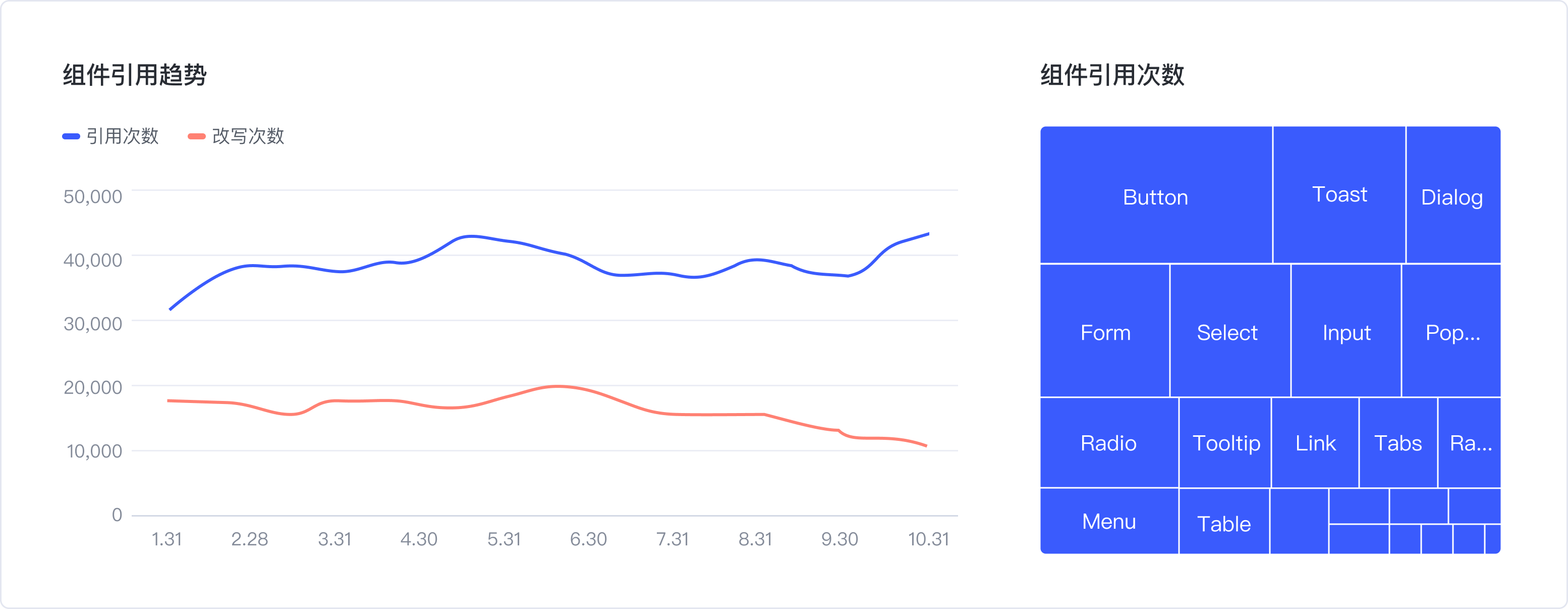解:把所有組件的引用次數(shù)加和,得到總體數(shù)值,并結(jié)合時(shí)間維度,觀察組件庫整體改寫數(shù)與引用數(shù)各自的變化趨勢。用線形圖來描述的話,隨著時(shí)間推移,引用越多,改寫越少,兩條線呈開口狀,那就表示組件庫處于越來越健康的狀態(tài)。反之則需要警惕了。同時(shí)我們搭建了一套評(píng)分體系,基于引用/改寫數(shù)值,通過歸一化和加權(quán)等一系列計(jì)算,by月/季度給組件庫易用性打分,也能精準(zhǔn)的知道組件庫易用性的表現(xiàn),如果分值是下降的,就要具體去定位哪些組件出了問題,再根據(jù)上述的方法相應(yīng)地進(jìn)行升級(jí)。