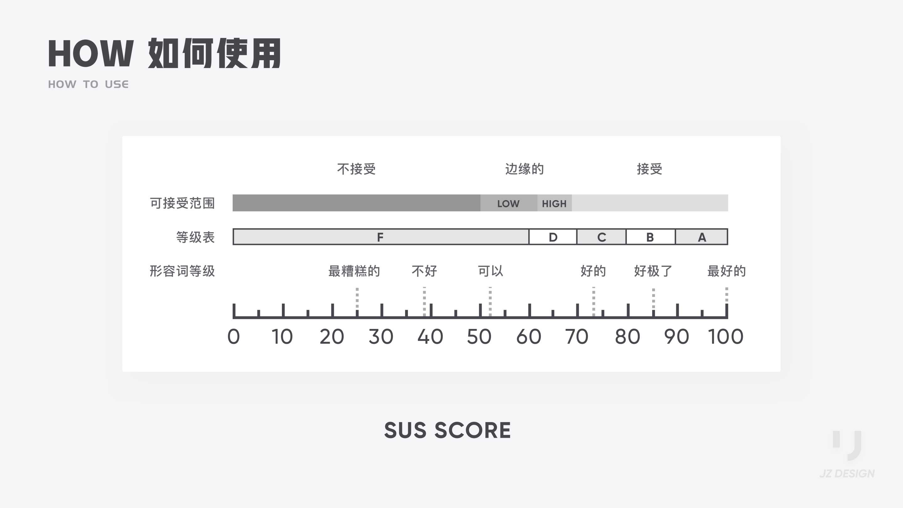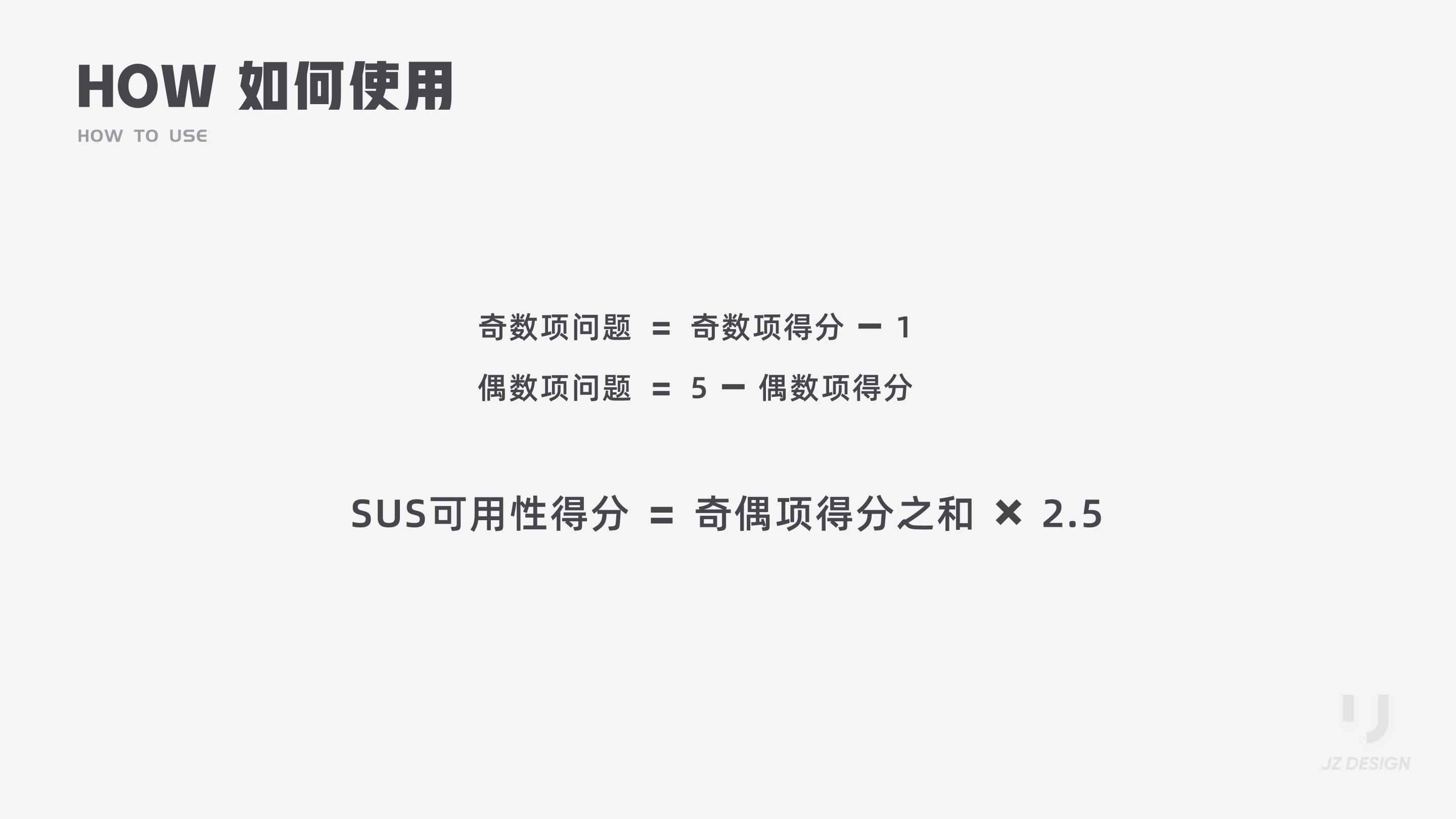 3. 將所有問(wèn)題最后的得分加在一起,然后乘以2.5;(每個(gè)題目的得分范圍記為0~4,最大值為40,SUS可用性得分的范圍在0~100,換算后乘以2.5)