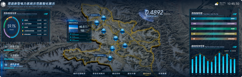 依托地理信息系統(tǒng),呈現(xiàn)塔縣地形,標(biāo)注零碳能源、建筑、交通等場(chǎng)景,清晰展現(xiàn)電力系統(tǒng)空間關(guān)聯(lián) 。