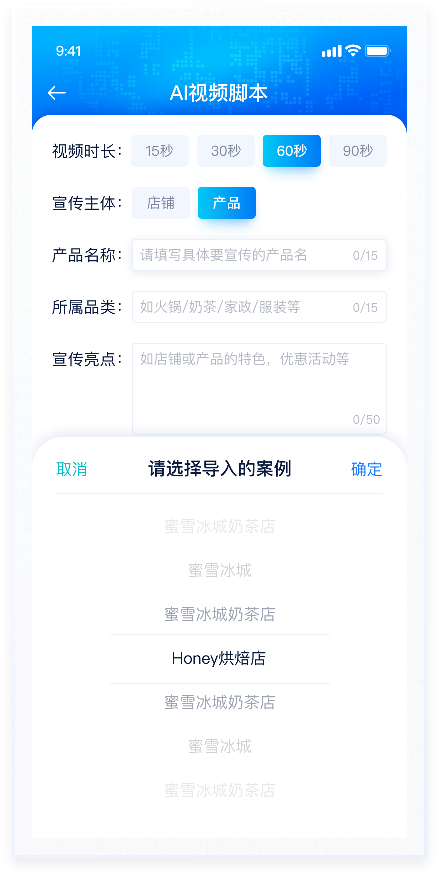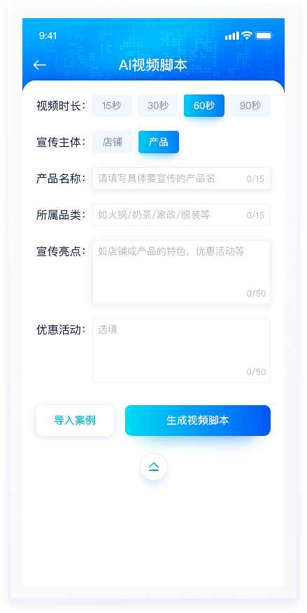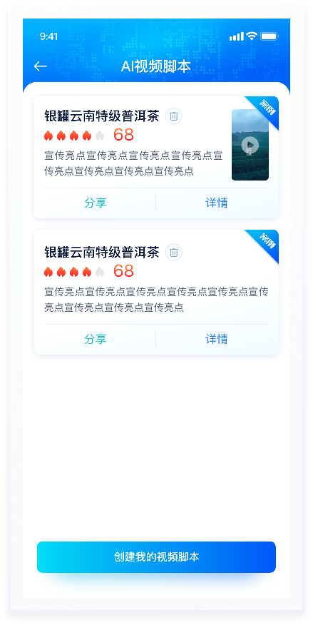 AI生成視頻腳本是用戶(hù)輸入相應(yīng)條件后,AI大模型通過(guò)系統(tǒng)算法生成視頻內(nèi)容。整體風(fēng)格較為科技感,因此在配色上使用藍(lán)色漸變及較重投影,符合產(chǎn)品屬性,能夠突出產(chǎn)品的創(chuàng)新性和先進(jìn)性。使用戶(hù)在使用過(guò)程中感受到強(qiáng)烈的視覺(jué)沖擊和沉浸感,這種體驗(yàn)有助于增強(qiáng)用戶(hù)對(duì)產(chǎn)品的興趣。