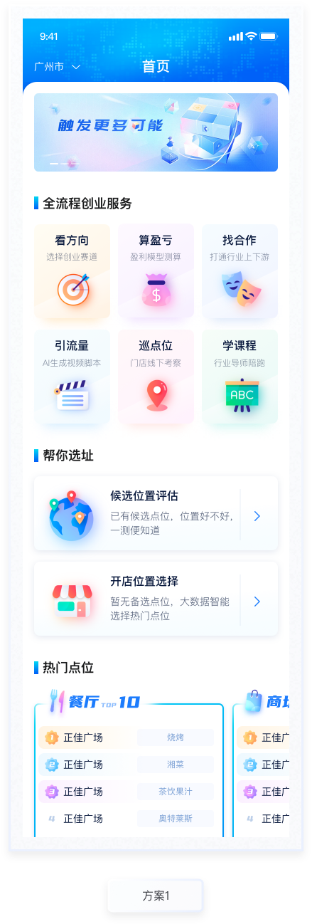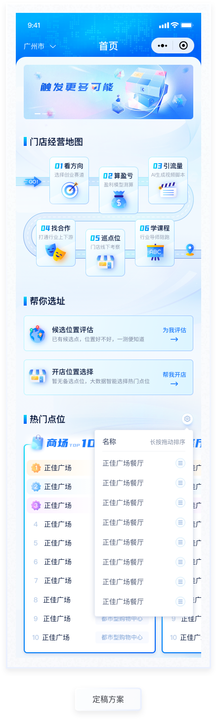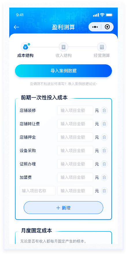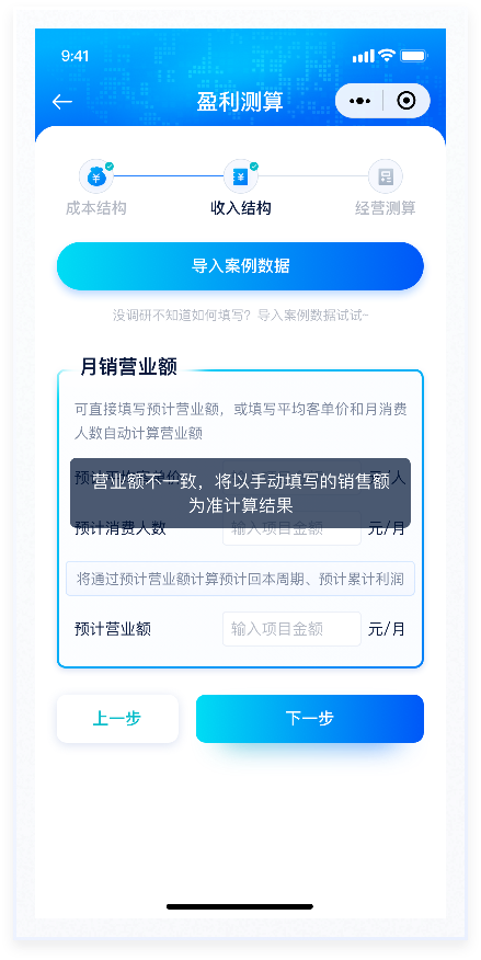 所盈利測(cè)算功能是產(chǎn)品的主要功能,通過(guò)AI對(duì)未來(lái)開(kāi)店盈虧情況進(jìn)行預(yù)測(cè)評(píng)估。本次設(shè)計(jì)主要優(yōu)化該流程的交互及視覺(jué)表現(xiàn),整個(gè)流程分為“成本結(jié)構(gòu)”“收入結(jié)構(gòu)”“經(jīng)營(yíng)測(cè)算”三個(gè)階段,過(guò)程填寫(xiě)情況放置在頁(yè)面頂部,一步了然。已填寫(xiě)使用主題色標(biāo)注,未填寫(xiě)則使用置灰顏色處理,符合用戶(hù)基本感知。按鈕使用與主色相近的漸變色。
