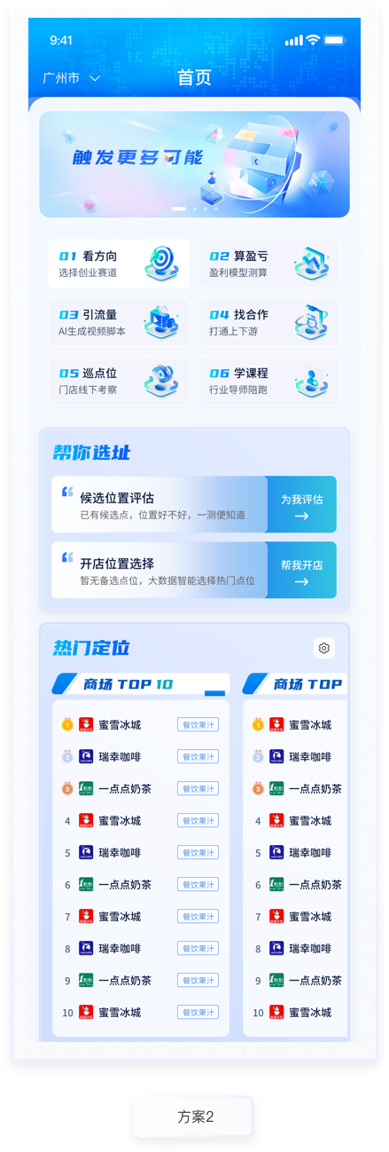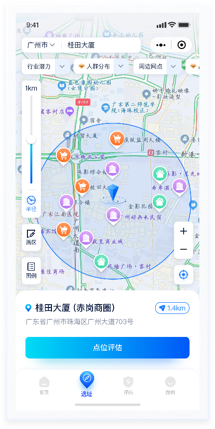 按鈕換膚在地圖上,“半徑”“選區(qū)”便于用戶(hù)對(duì)開(kāi)店范圍的選擇,“圖例”則更側(cè)重圖標(biāo)說(shuō)明性?!胺糯蟆薄翱s小”“定位”則是對(duì)顯示內(nèi)容的操作。