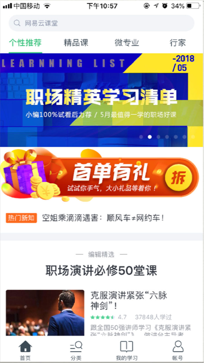 1.首頁根據(jù)產(chǎn)品的不同特色,設(shè)置了二級導(dǎo)航,將個性化、精品課、微專 業(yè)、行家作為二級導(dǎo)航標題,既能用來統(tǒng)一呈現(xiàn)特色內(nèi)容,又能保證頁面信息的 層級關(guān)系清晰明了;
